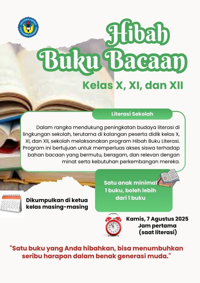 Program sedekah buku merupakan salah satu kegiatan positif yang telah berjalan dengan antusiasme tinggi di lingkungan sekolah. Kegiatan ini mendapat respon luar biasa dari seluruh warga sekolah, mulai dari siswa, guru, hingga kepala sekolah yang ikut berpartisipasi dalam berbagi ilmu melalui buku. Tidak hanya itu, dukungan juga datang dari komite sekolah yang turut serta menyumbangkan satu dus besar buku sebagai bentuk kepedulian terhadap gerakan literasi.